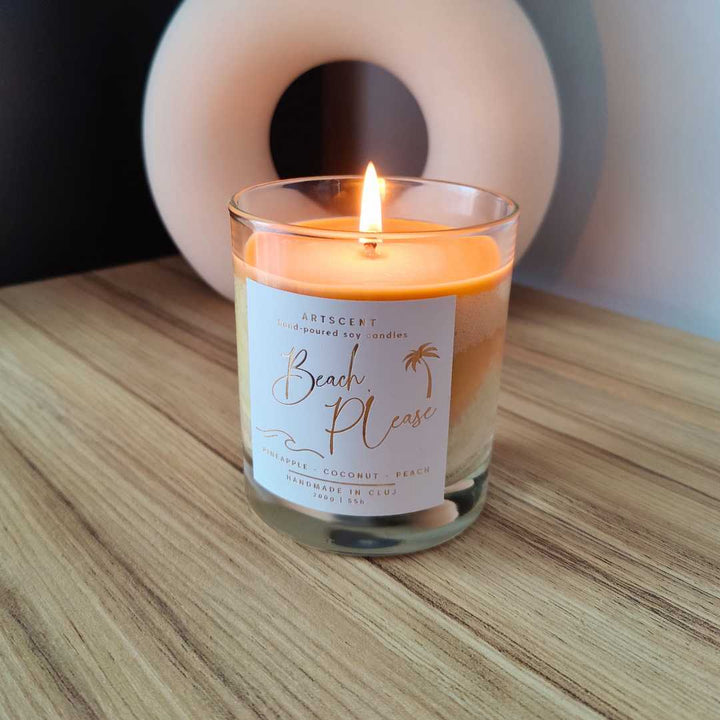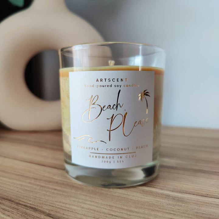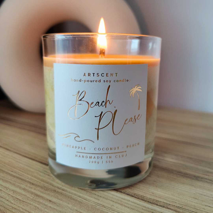 Evadează într-o oază tropicală cu Lumanarea parfumata Beach Please! 🍍🥥 Note dulci-acrișoare de ananas și portocală, îmbrățișate de un miez cremos de cocos, care te poartă direct pe plajă, sub soarele verii. ✨
