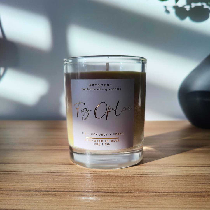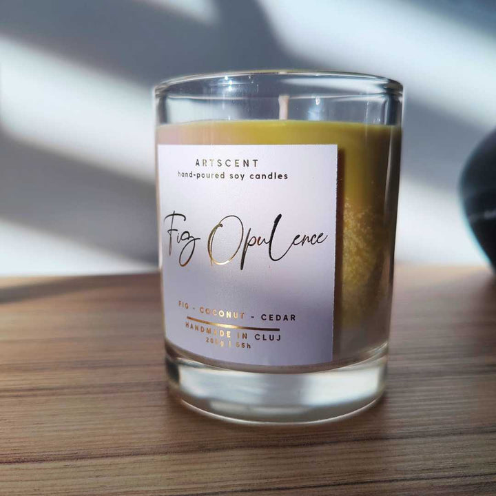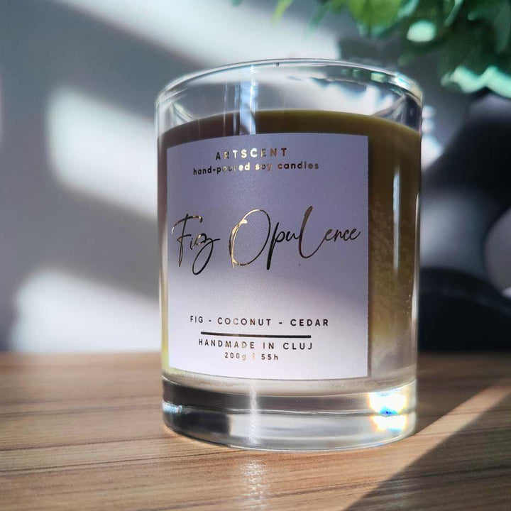 Lumânarea Parfumată Fig Opulence îmbină frunzele verzi de smochin, dulceața fructului copt și accente exotice de cocos, așezate pe o bază caldă de cedru – o esență sofisticată ce evocă grădinile mediteraneene.